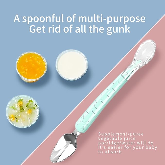 - 👶Baby Silicone Food Spoon: The design of the two ends of this spoon is very convenient, one end is a soft spoon for feeding the baby, and the other end is a mud scraping spoon, which is suitable for all kinds of baby food, fruit.