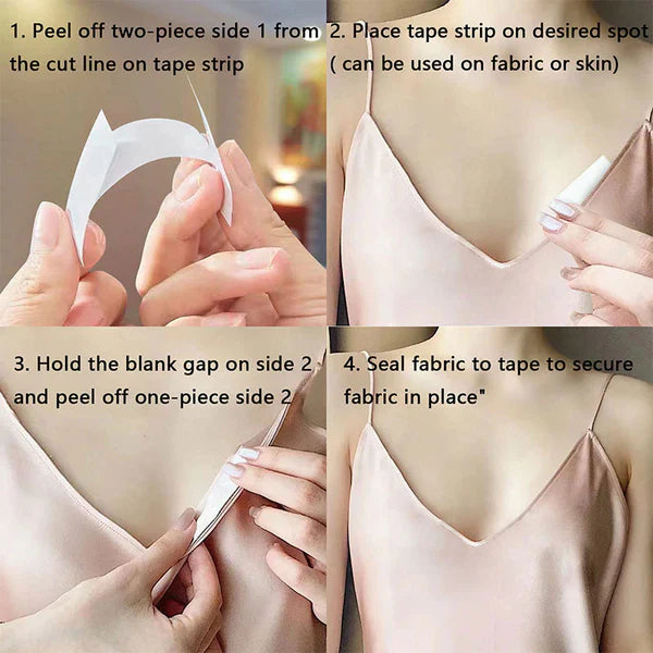 Invisible and Practical:Â Transparent tape is highly compatible with all colors of clothing and skin tone. Unlike pins, our double sided tape is invisible to everyone but you!