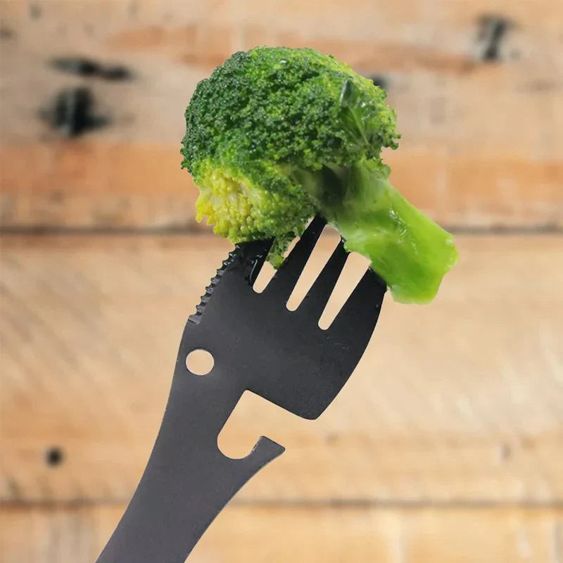 - Fork, Knife, Spoon, Can Opener and Bottle Opener in one tool makes dining outside easy.