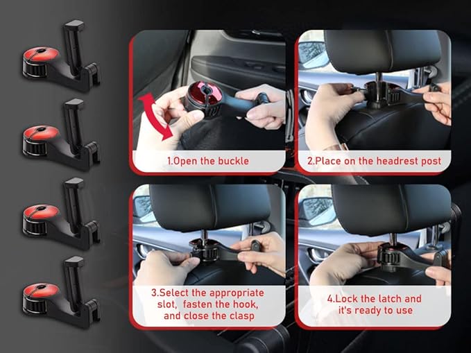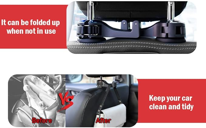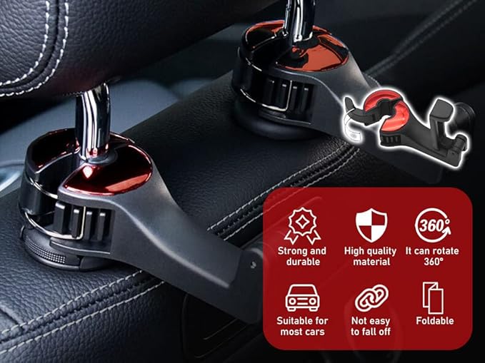 - π Humanized Design: The universal car headrest hook has an adjustable lock that is suitable for most car seat bars. The car seat hook holder is 360Β° rotatable and can be used both front and rear. It can be hidden on the seat when the car seat hooks is not used.