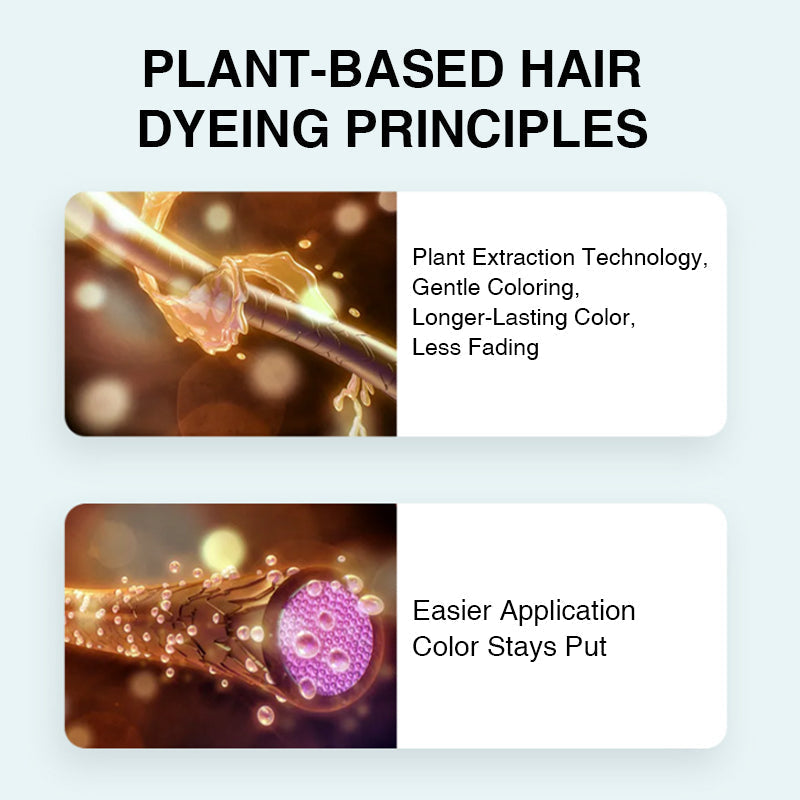 Plant-based hair dyeing principle: Use the power of plant extract technology to dye your hair gently and effectively. This gentle process also protects your hair while providing long-lasting color.
