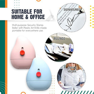 - 2-in1 protection stamp - Roll the identity protection roller and the dark ink will make all text illegible. Includes a built-in ABS imitated blade knife helps in opening packages.