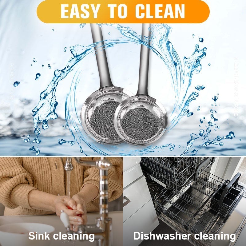 - The filter screen is even and fine and quickly drains water and grease. Used to filter fried food, filter soybean milk, filter oil residue, skim blood foam, floating foam, pepper, spices, etc.