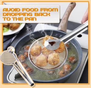 |  The creative tongs design makes it easier to grab food in the pan, helping you pick up the food after frying, and drain the excess fat at the same time.  This strainer will prevent oil from splashing and grip the food firmly without dropping it back to the frying pan. It is great for filtering oil while frying different kind of foods. FEATURES